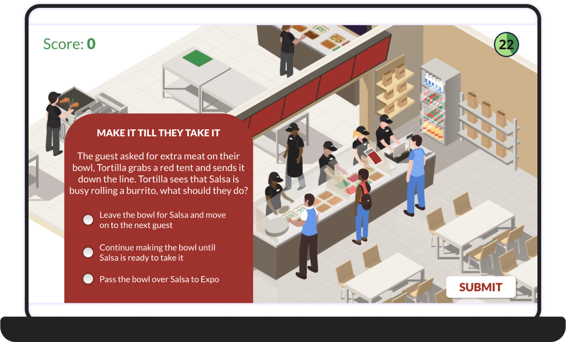 Integrated audio design: energetic intro music, ambient kitchen noise, and sound cues for right/wrong answers to heighten realism and reinforce behavior
